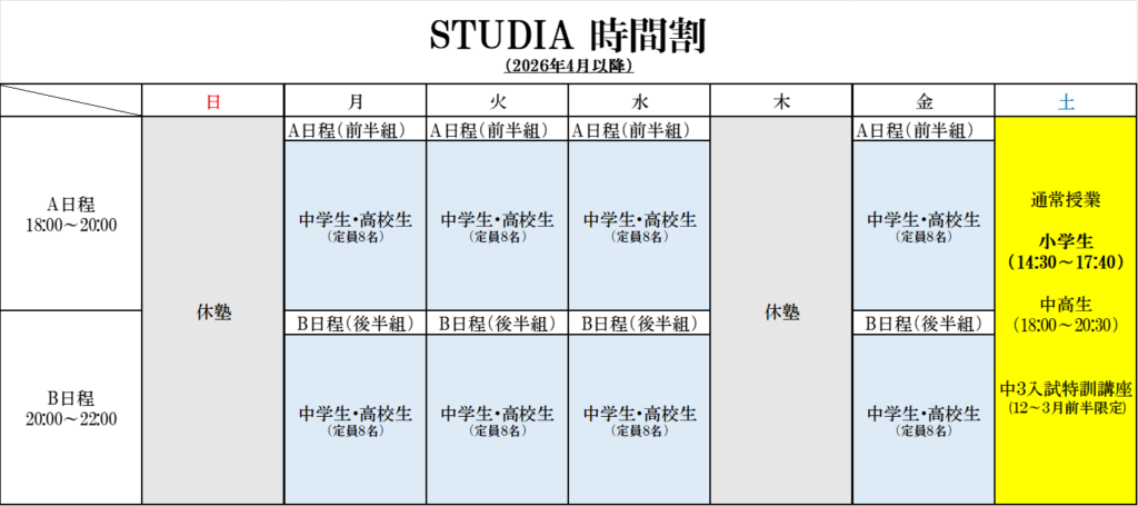 木曜日・日曜日は、基本的に休塾日といたします。(*祝日に関しては基本的に開塾いたしますが、不定期に休塾日を設けさせていただく場合がございます。その場合は、弊塾からご連絡させていただき、当該日が通常授業の方は適宜お振替対応をいたします)